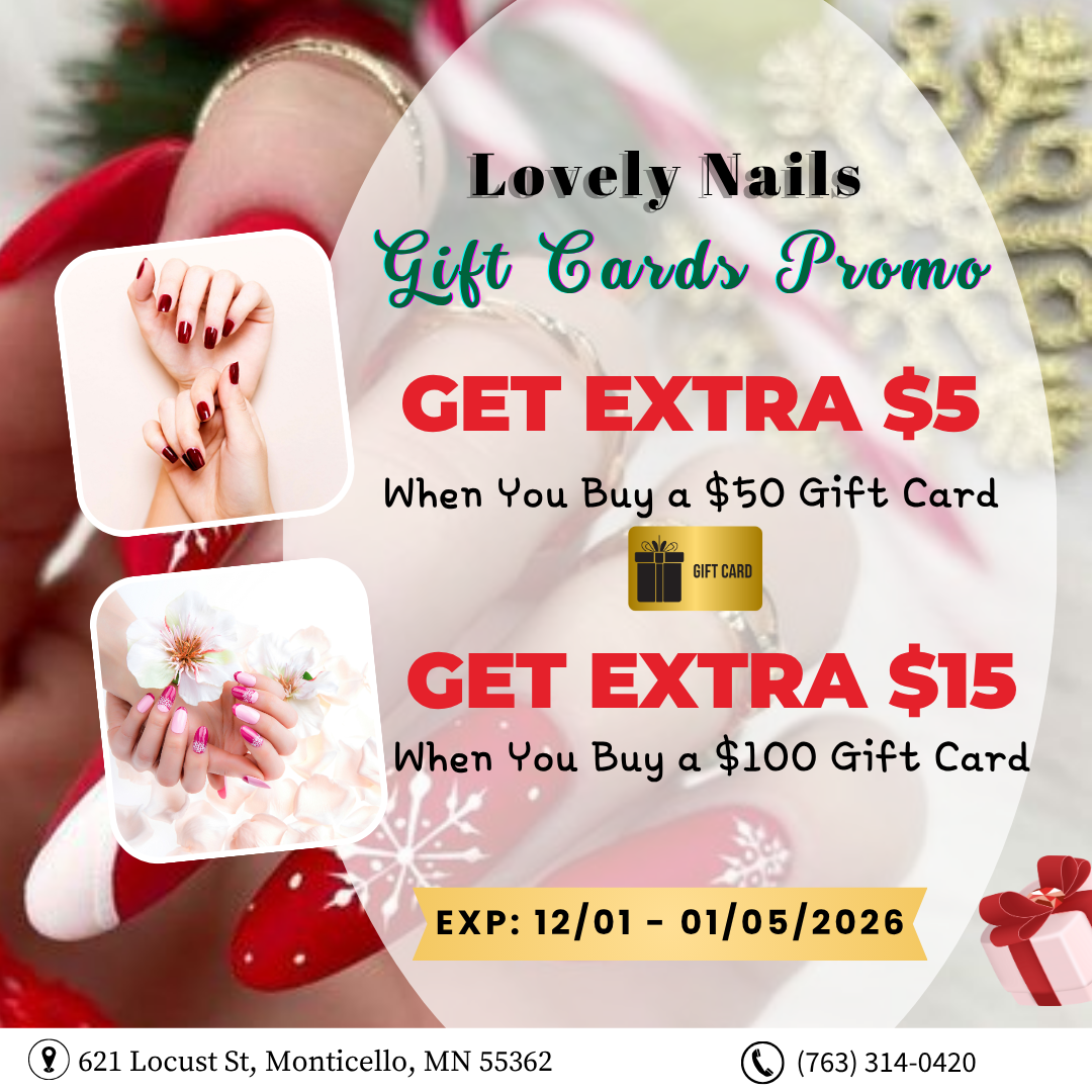 Are you looking for a reliable nail salon to perform nail and spa services? Look no further, Lovely Nails is the ideal location. Visit us at 621 Locust St, Monticello, MN 55362, for beauty treatments and find yourself looking even more beautiful with a stylish look!